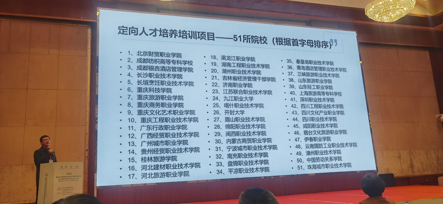 1月3日,2024年新时代文旅职教研究院年会暨第四期教育部供需对接就业育人项目旅游大类(第一期)立项院校发布会在贵阳举行。年会发布了第四期教育部供需对接就业育人项目旅游大类(第一批)立项名单,我校申报的项目——“四川文化产业职业学院跨界融合型旅游人才定向培养项目开发与实践”成功入选。我校文化旅游学院院长梁中正及相关专业教师受邀参加会议。