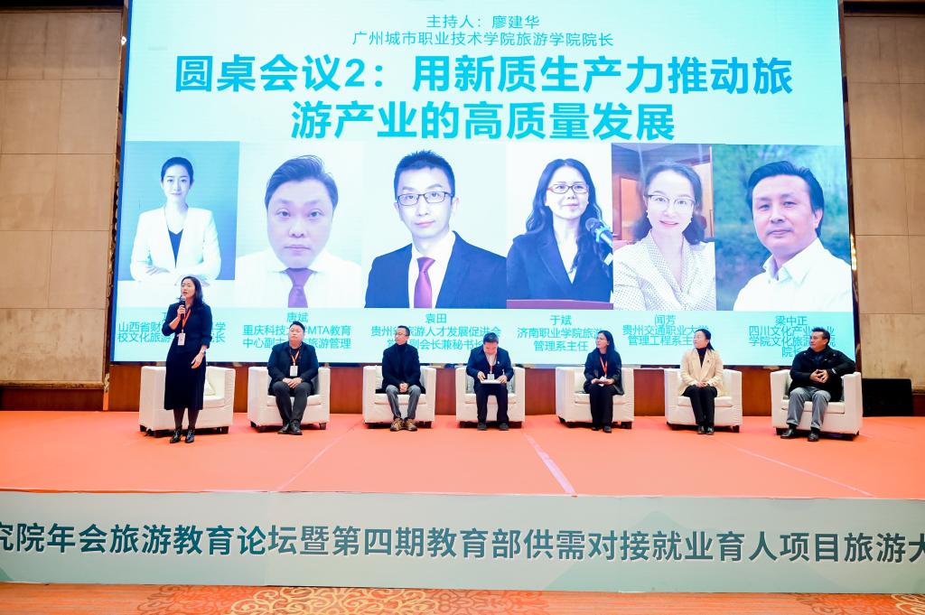 本次年会举办了新时代旅游职教论坛。16名全国旅游院校校长、行业专家作主旨演讲。梁中正院长受邀参加“用新质生产力推动旅游产业高质量发展”圆桌会议。他从“大处着眼”、“小处着手”、“抓住核心”、“保持理性”四个方面分享了自己的观点,引起了与会专家的共鸣。