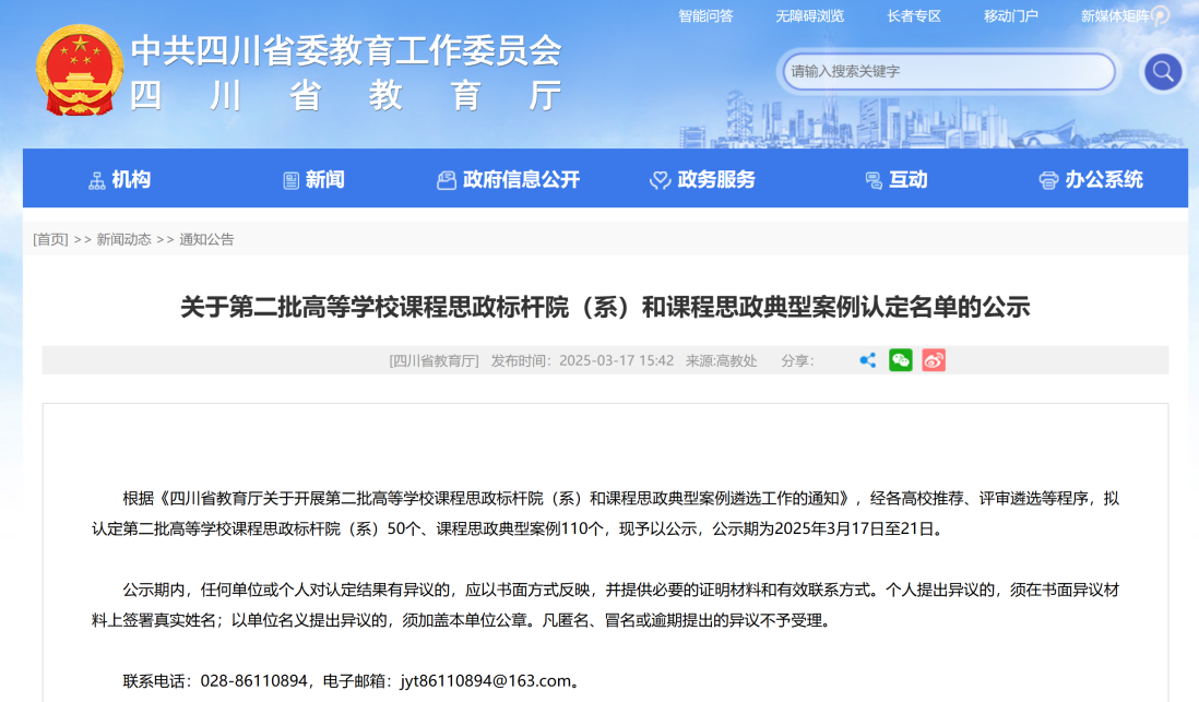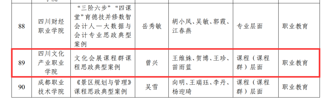 近日,四川省教育厅公示了关于第二批高等学校课程思政标杆院(系)和课程思政典型案例认定名单,名单认定高等学校课程思政标杆院(系)50个、课程思政典型案例110个。其中,本科教育78项,职业教育32项,我校文化商学院入选高等学校课程思政典型案例。