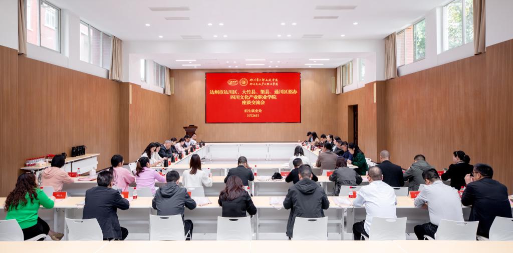 黄萍在座谈交流会上致辞,她代表学校对达州市区县招考系统一行的来访致以热烈欢迎,介绍了学校的办学历程、办学特色和发展成就。她表示,学校将深化与达州市区县招考系统的沟通合作,共同为学生成长成才搭建良好平台,积极探索创新人才培养模式,培养造就更多文化产业类高技能人才,携手为四川经济社会发展和职业教育事业做出更大贡献。