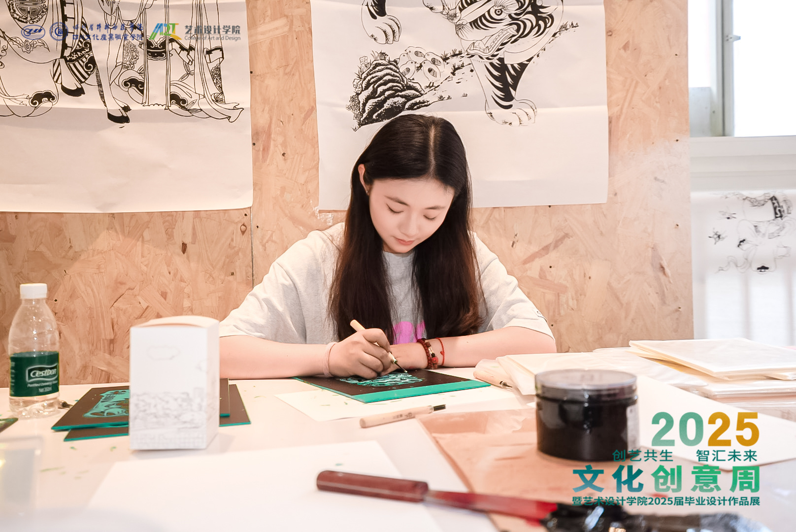 启动仪式上,夹江县文化广播电视体育和旅游局、完美世界教育(北京)科技有限公司负责人代表地方政府和企业致辞,充分肯定校产教协同育人成效。成都市“三城三都” 研究院授予学校 “文创产业转化基地”,学校为合作企业授牌 “教师实践基地”“实习就业基地”。校领导与嘉宾上台共同体验版画拓印的独特魅力,每人拓印一字,共汇成句,宣告第三届文化创意周正式开启。