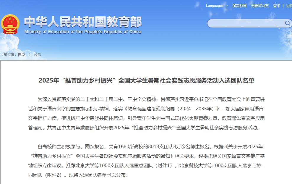 为贯彻落实习近平总书记关于语言文字工作的重要指示精神,教育部语言文字应用管理司、共青团中央青年发展部组织开展此次活动,吸引了全国1680所高校的8013支团队、8万余名师生报名。经专家评审,北京大学等1000支团队入选重点团队。