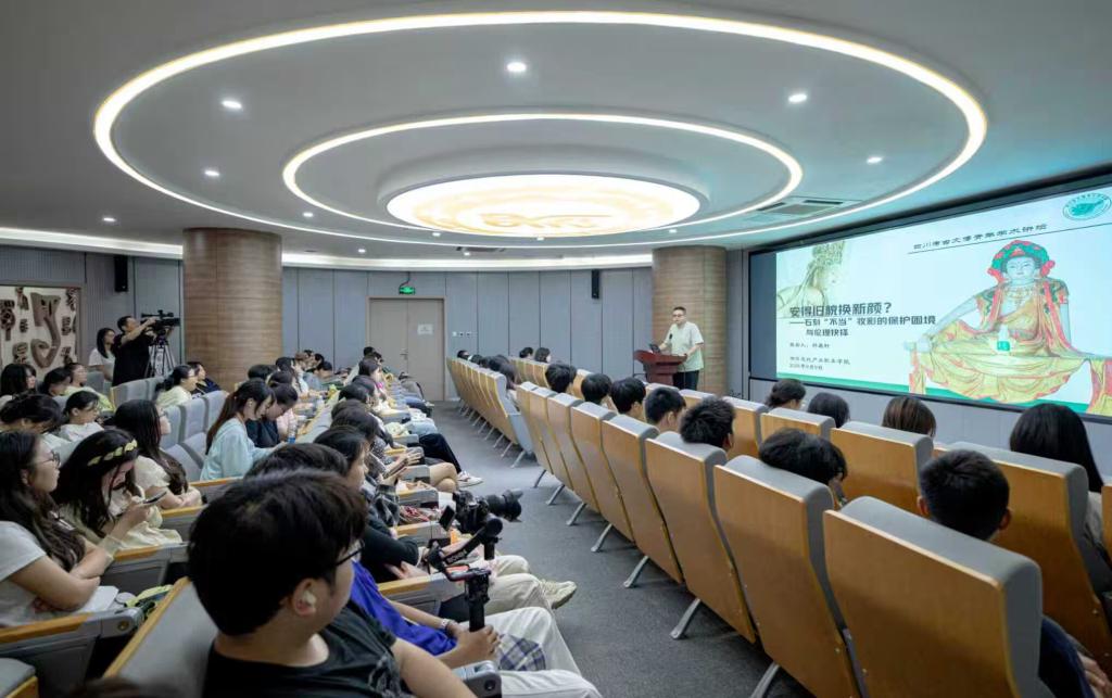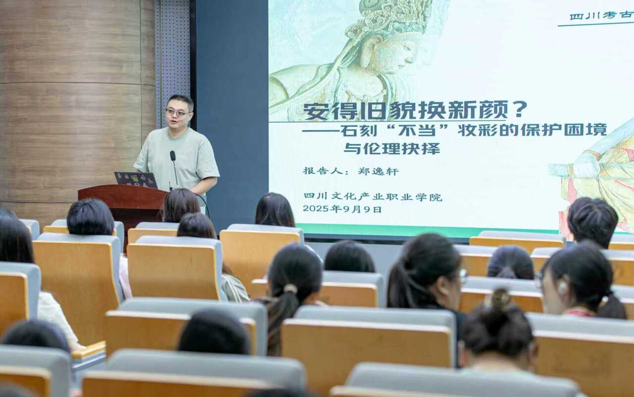 讲座由四川省文物考古研究院博士后郑逸轩博士主讲,主题为《安得旧貌换新颜:石刻“不当”妆彩的保护困境与伦理抉择》。在讲座中,郑逸轩博士从法律、技术、认知与伦理维度深入剖析了石刻文物修复中“不当”妆彩现象的成因与危害。他结合大量案例和数据,深入阐释了石刻保护的现状和困难,并提出要通过提升公众文保意识、完善技术规范与伦理机制来推动解决。现场互动环节气氛热烈,师生们积极提问,围绕修复实践与价值认知展开交流。