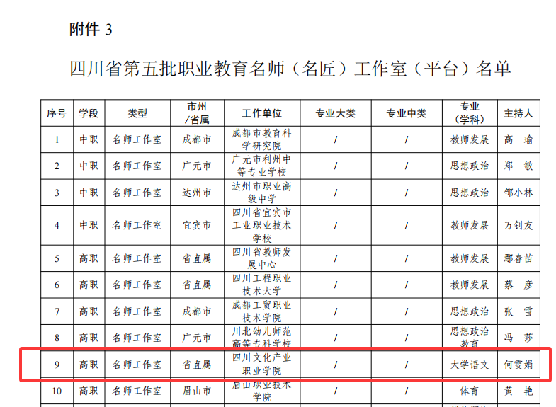 近日,四川省教育厅公布了第五批职业教育名师工作室领衔人名单,我校人文与国际教育学院大学语文教研室主任何雯娟入选。