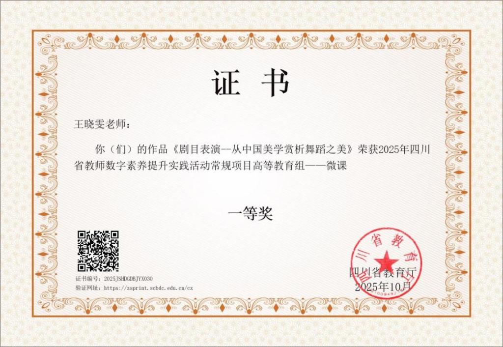 近日,四川省教育厅公布2025年教师数字素养提升实践活动结果,人文与国际教育学院王晓雯老师的微课《剧目表演一中国美学赏析舞蹈之美》,在高等教育组斩获一等奖。