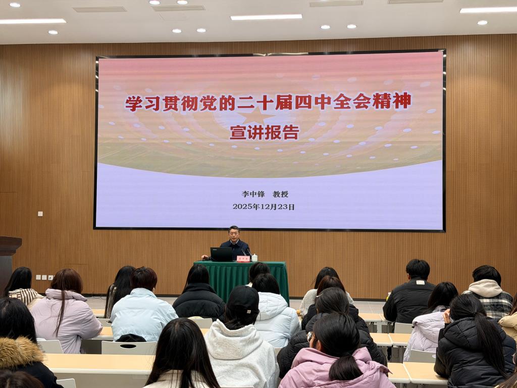 2025年12月23日,校党委副书记、院长李中锋在创慧楼多功能厅讲授形势与政策课。李院长以“学习贯彻党的二十届四中全会精神的宣讲报告”为题,全面系统阐释了全会精神,他带领同学们重温了“十四五”时期我国取得的伟大成就,聚焦“十五五”时期的发展目标与战略任务等核心内容,紧密结合四川发展实际展开深入解读。授课娓娓道来、深入浅出,引发同学们强烈共鸣。最后,他引导同学们要挺膺担当、投身实践,让青春在全面建设中国式现代化的伟大进程中绽放绚丽之花。