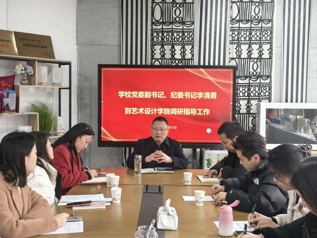 2026年1月22日,校党委副书记、纪委书记李清勇前往艺术设计学院开展调研指导工作。座谈会由艺术设计学院党总支书记郭光海主持,学院领导班子成员、专业负责人以及教师代表共同参会。