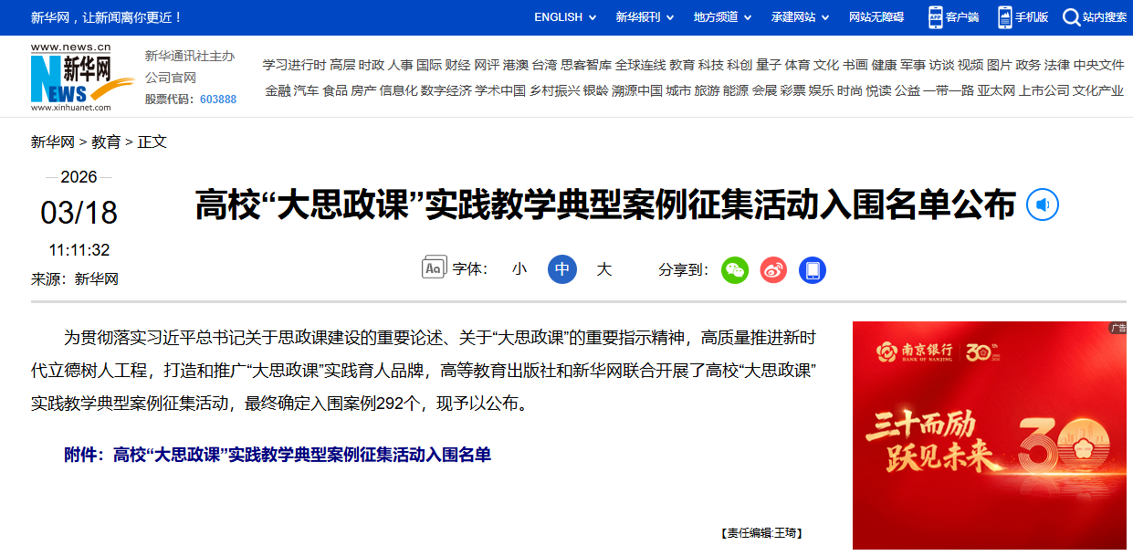 近日,高等教育出版社与新华网联合举办的全国高校“大思政课”实践教学典型案例征集活动结果揭晓,我校马克思主义学院推选的“行走的思政课:在悬崖村的育人实践中厚植‘人民至上’”案例(团队成员:李嫄、张宗胜、马吉宏、黄敏、杨维)成功入选。