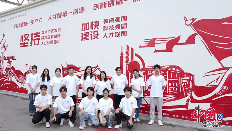艺术设计学院教工党支部以深入学习宣传贯彻党的二十大精神为契机,以足球场空白墙壁为主阵地,绘制党的二十大精神文化墙,让党建工作“动”起来,让党建阵地“活”起来。绘制前期,校党委委员、副院长朱霖、宣传统战部、艺术设计学院党总支和指导教师就墙绘内容、构图和绘制细节进行了多次沟通;指导教师充分学习研究党的二十大报告关于科教兴国战略指导精神,深刻理解精神内涵与实质,与设计小组反复沟通、改进设计稿,精心打造“高颜值”党的二十大精神文化墙,积极营造“处处是课堂,时时悟党建”的浓厚氛围,力争在手绘墙上留下最美的画面。