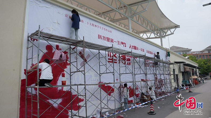 绘画现场,师生热情高涨、铆足干劲,将对党的满腔热爱落在了每一道工序上。经过大家的协作努力,原本普通的空白墙变成了一面波澜壮阔的党的二十大精神文化宣传墙,让原本冰冷的墙面有了“灵魂”,墙面上的一排大字“科技是第一生产力、人才是第一资源、创新是第一动力。”形象生动地再现党的二十大关于深入实施科教兴国战略、人才强国战略、创新驱动发展战略的核心精神。