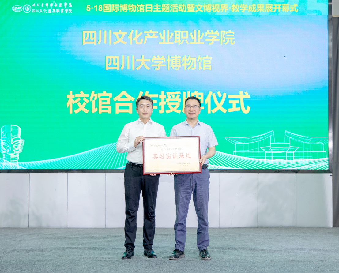 活动举行了校馆合作授牌、产业导师授聘和明昌博物馆文博专业人才奖助学金颁发等仪式。四川文化产业职业学院党委副书记、院长李中锋代表学校与四川大学博物馆互授文博专业实习实训基地和合作共建基地牌匾。
