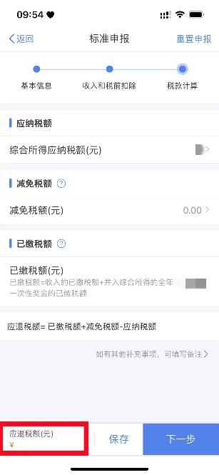 在税款计算页面,核对综合所得应纳税额、减免税额、已缴税额(收入的已缴税额),如有其他补充事项,可填写备注,若无其他补充事项,核对页面下方的“应退税额”或“应补税额”后,点击“下一步”。