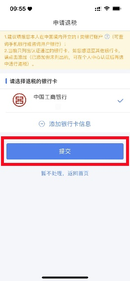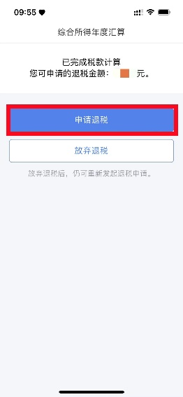 在银行卡页面,选择退税银行卡,即可完成退税申请。收入超出12万元但应补税额≤400元,申报提交后无需缴款,点击【享受免申报】。