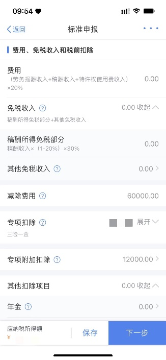 第六步:在收入和税前扣除页面,认真核对已填报的综合所得收入、费用、免税收入及专项扣除等各项扣除项目,有无漏报或错误,确认无误后点击“下一步”;