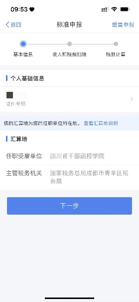 在基本信息页面,仔细核对个人基础信息、汇缴地等,点击“下一步”。
