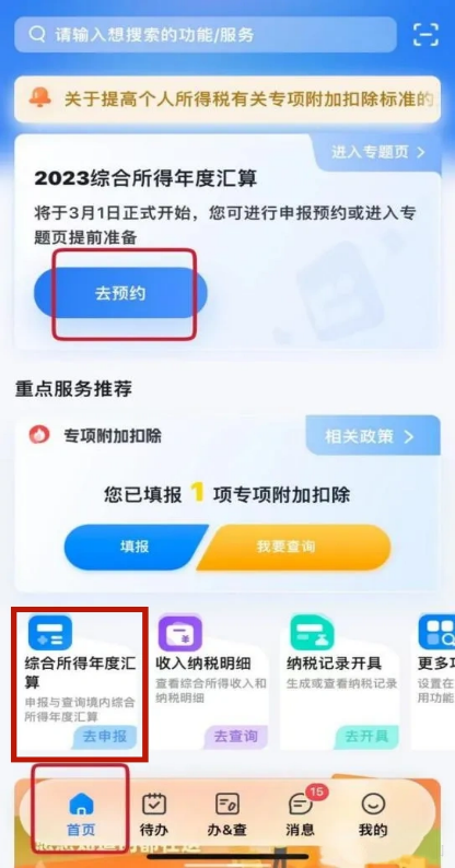 第一步:登录手机“个人所得税”APP,进行2023综合所得年度汇算预约,或于3月21日直接点击首页“综合所得年度汇算”,然后选择2023年度进行汇算。