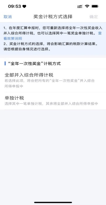 请合理选择【工资薪金】中“全年一次性奖金的计税方式”,因为不同计税方式会导致不同税额,您在正式提交申报前可比较选择最优计税方式,具体方法为:点击【工资薪金】进入计税方式选择,分别选择将奖金【全部并入综合所得计税】,或选择【单独计税】,点击进入下一步查看具体退、补税金额,择优选择计税方式。