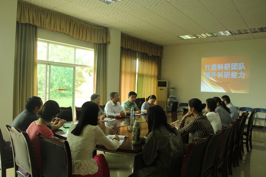 陈敬贵以科研在教师成长中具有的重要意义引入主题,重点围绕科研团队构建与科研能力提升两方面与在座教师进行了深入交流。在解析如何打造科研团队时,他强调了团队领军人物的重要性,应具备良好的学术素养和修养。在讲到如何提升科研能力时,他结合自身经验,建议教师们在长期的积累过程中不断完善学习与思考能力,强化写作能力与语言表达能力,以思考、写作、研究有机结合的方法进行科研实践。