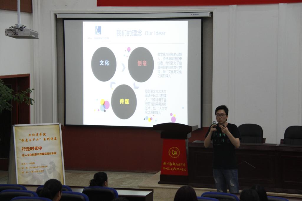 5月13日,冰人文化传媒工作室在第二教学楼105教室为全院师生带来了名为“行走时光中-——冰人文化创意传媒分享会”的专题讲座,这标志着我院开始启动新一季的“创意与产业”系列讲座。