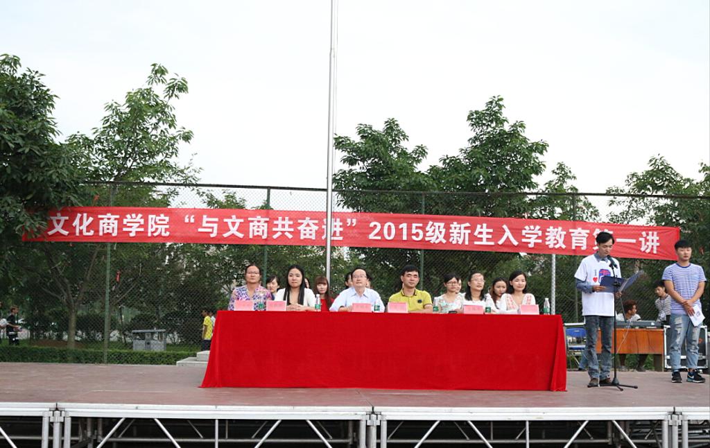 9月14日下午,我院“与文商共奋进”2015级新生入学典礼在我校足球场举行。校领导罗晓东院长,我院党总支书记、院长宋晓,副院长王霜凌、党总支副书记邓颖颖、教师代表张伟、学生科全体辅导员及2015级新生参加开学典礼。