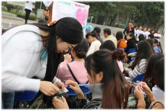 爱心集结活动是我院2014级商务经纪与代理班《商务活动策划与组织》课程的实践教学项目,由全班同学共同策划组织完成。创意来源于新生军训服,军训结束后,很多新生面对日常无法再穿着的军训服很是苦恼,如何变废为宝,形成了“爱心集结”和创意。大家收集不再穿着的军训服装,剪裁成为爱心的样式,填充纤维,再缝制上文化商学院的LOGO,就变成了一个个充满爱意的迷彩抱枕,赠送给成都周边的留守儿童,为他们送去爱心和温暖。