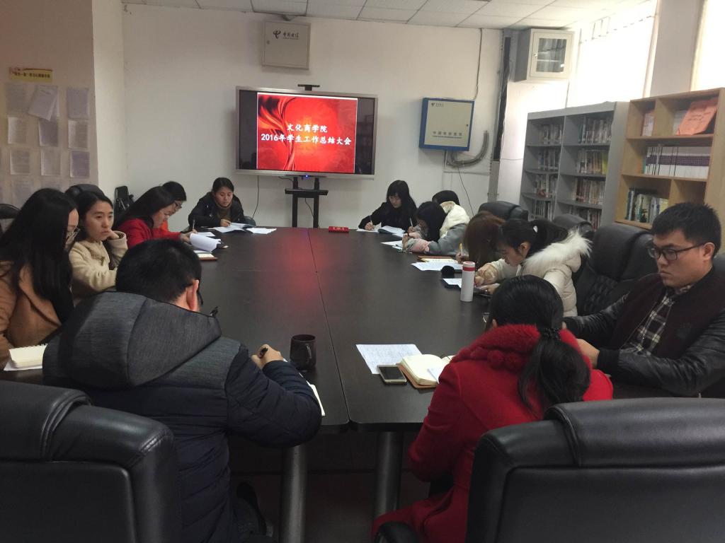 近日,文化商学院在第二教学楼四楼会议室召开2016年度学生工作总结会,学院党总支副书记焦健、学工科负责人吴燕霞及全体辅导员参加会议。