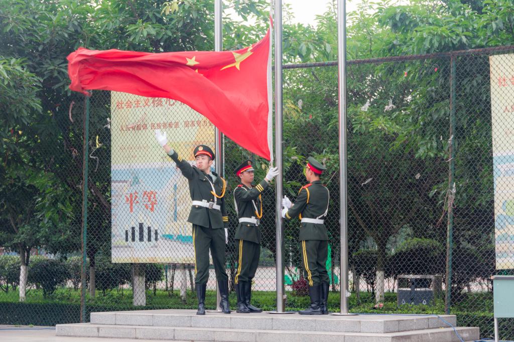 国旗队的旗手们着装整齐,迈着矫健的步伐,护送着鲜艳的五星红旗入场,伴随着雄壮嘹亮的《义勇军进行曲》,五星红旗冉冉升起,同学们精神饱满,齐行注目礼,高唱国歌,为身为一个中国人而感到骄傲和自豪。