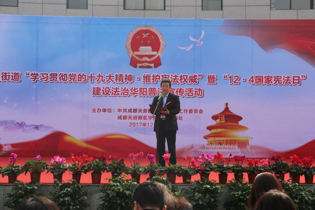 本次普法宣传活动由中共成都天府新区华阳街道工作委员会、成都天府新区华阳街道办事处主办,天府华阳、各社区协办,旨在进一步弘扬宪法精神,维护宪法权威,推动“七五”普法规划全面实施,推进华阳街道法治宣传教育工作,加强法治文化建设,弘扬法治精神,进一步调动市民参与法治文化宣教,建设美丽华阳,营造全社会尊法学法守法用法的良好氛围。活动受到了四川电视台、成都电视台等多家主流媒体关注报道。