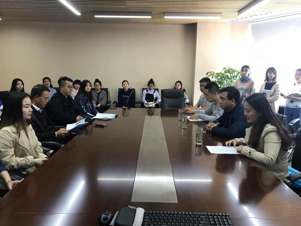 同学们首先在总经理牛嘉良的引领下参观公司,感受公司良好的工作环境及氛围。在交流会上,班主任杨萌老师首先就班级成立后的学习、生活情况向公司作简要报告,班长万琪琳代表全体同学向公司汇报本学期的学习及活动计划。文化商学院院长宋晓向新天杰企业对订单班的支持表示感谢,希望同学们不要辜负企业和学校的良苦用心,严格要求自己;希望学院教师将校企双方人才培养定位要求贯彻落实。林董事长提出,让同学们增加与公司的互动,了解公司经营范围与经营项目,发展自己的职业兴趣。他鼓励班委有针对性地逐步与公司对接,加深同学们对新天杰企业文化和经营模式的了解。