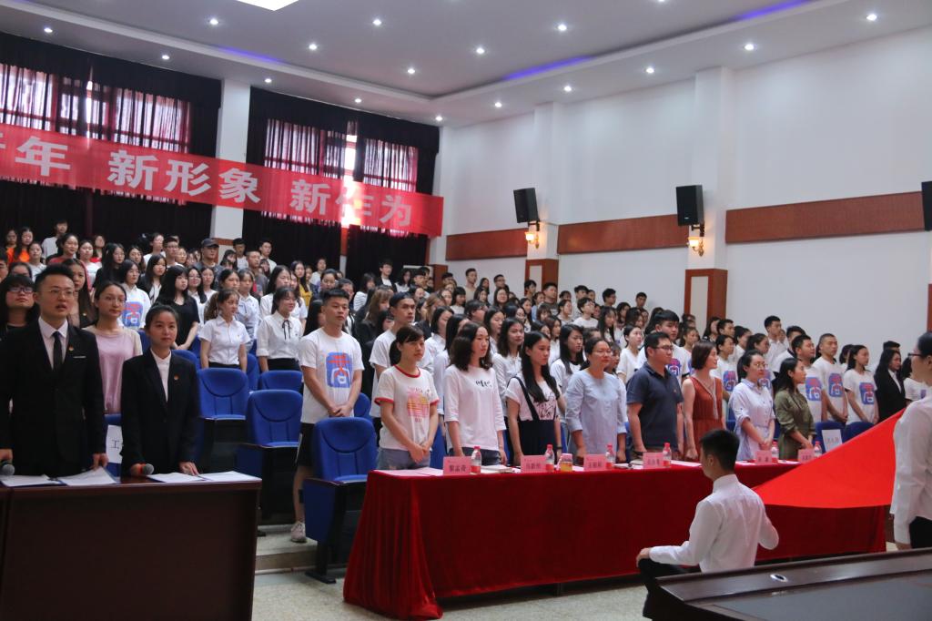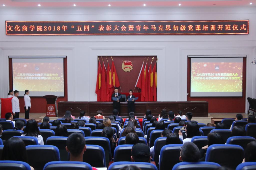 为纪念五四运动99周年,继承和发扬“五四”精神,树立典型、表彰先进,增强团组织的凝聚力和号召力,激励各级团员青年为推进我院各项工作贡献青春和智慧,也为进一步引领广大青年积极向党组织靠拢,深入学习贯彻党的十九大精神,开展好“青马工程”相关工作,5月14日晚,文化商学院党总支在二教多功能厅召开2018年“五四”表彰大会暨青年马克思初级党课培训开班仪式。我院党总支副书记焦健、分团委书记吴燕霞、学生党支部全体党员及各年级优秀学生代表参加了活动。