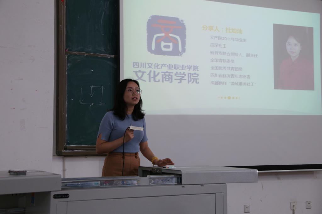 4月,文商学院邀请2011届商务专业毕业生杜灿灿和她的“社工小伙伴”重回校园,分享他们的社会工作经历。