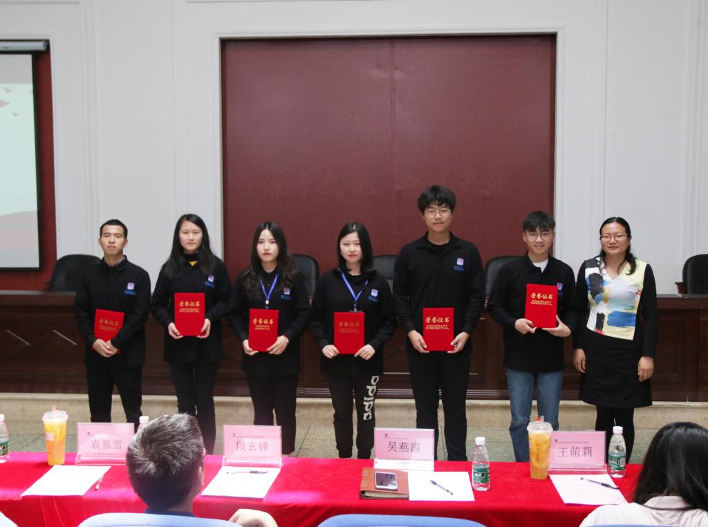 吴燕霞宣读了文化商学院2018-2019学年五四表彰决定,并指出各团学组织2018-2019学年在学院党委和校团委的领导下,为校园文化建设、学生团队建设和社会实践等方面取得显著成绩,随后为获奖集体与个人颁发了奖状和荣誉证书。