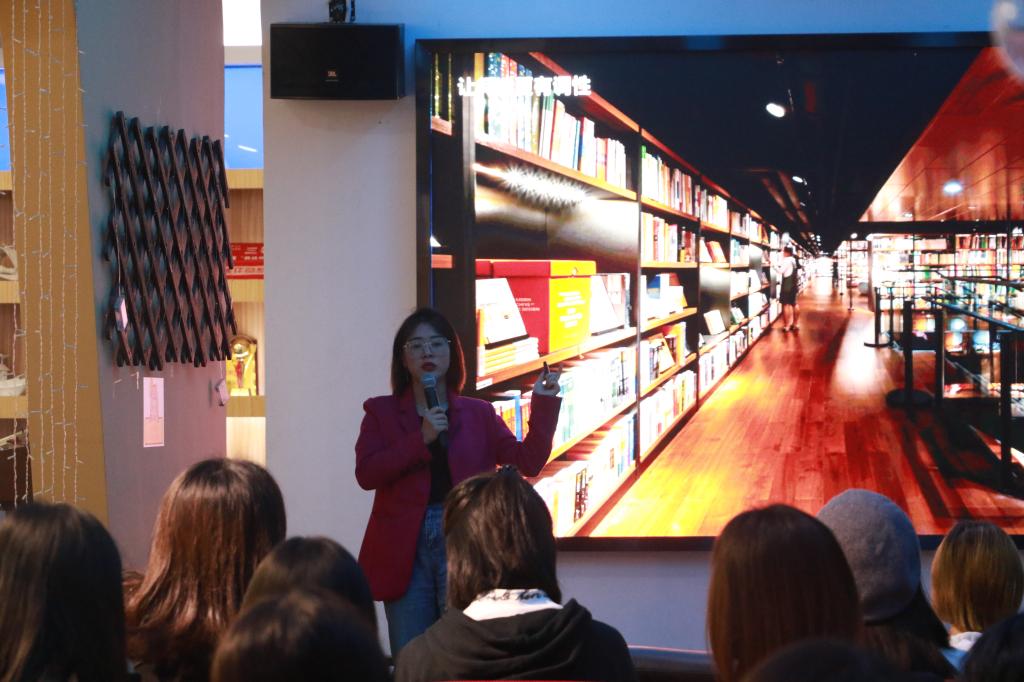 在这场名为“以阅读为信仰———零售行业的活动引领思维”分享会上,岳圆圆经理首先介绍自己的职业成长经历,向同学们介绍了“书店营销人的日常”,接着以案例分析的方式与同学们分享了如何在书店做活动策划的感悟,最后还回答了同学们关于书店零售业若干提问。