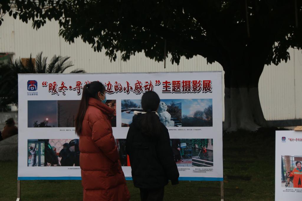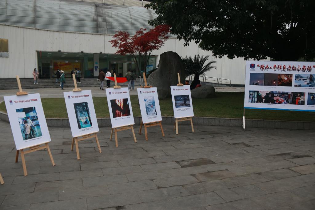 为了丰富学院同学们的课余文化生活,培养同学们发现美、感知美、领悟美的能力,文化商学院于12月8日在艺体中心门口广场处举办了“暖冬·寻找身边的小感动”主题摄影展。