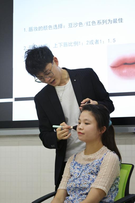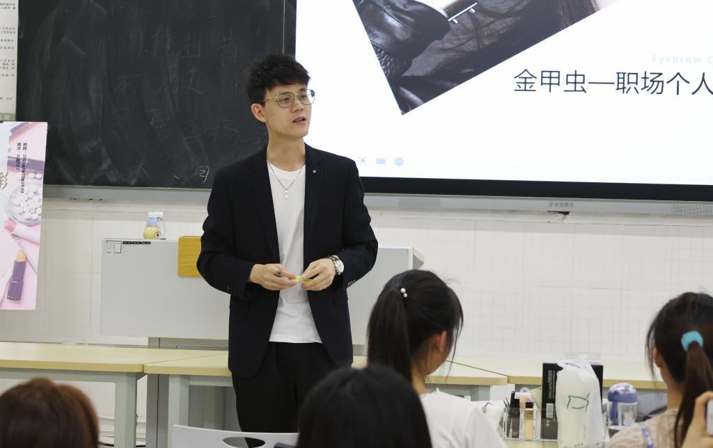 邢志伟首先强调了个人形象管理对职场人的重要性,接着向同学们介绍了符合当代职场审美的个人形象应当具备的特点,最后针对我校女生较多的特点,细致地分享了职场女性美妆技巧,并邀请在场的同学担任模特,现场进行了实操示范。