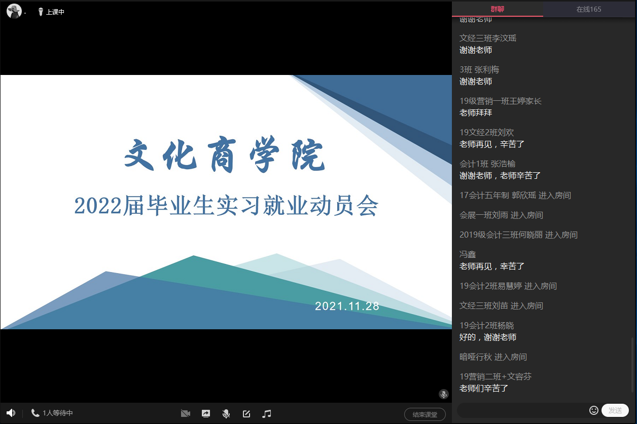 为进一步完善2022届毕业生实习工作,引导学生做好实习就业心理准备,11月28日19:00,文化商学院借助QQ群课堂平台,在线上组织召开了2022届毕业生实习、就业动员大会。文化商学院党总支书记王维姝、文化商学院副院长曾兴、党总支副书记吴燕霞出席并作实习就业动员,毕业班辅导员及全体2022届毕业生参加会议,实习管理教师、就业干事钟昱蕾主持会议。