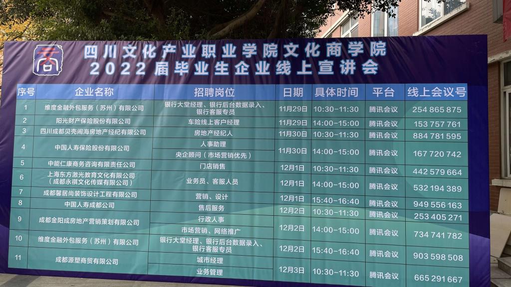 为切实做好毕业生就业工作,大力构建毕业生与用人单位的交流平台,进一步推动校企合作,共建实习就业基地,帮助毕业生获得更多就业机会,在严格落实疫情防控工作的前提下,11月29日—12月3日文化商学院与企业共同完成12场线上企业宣讲会。