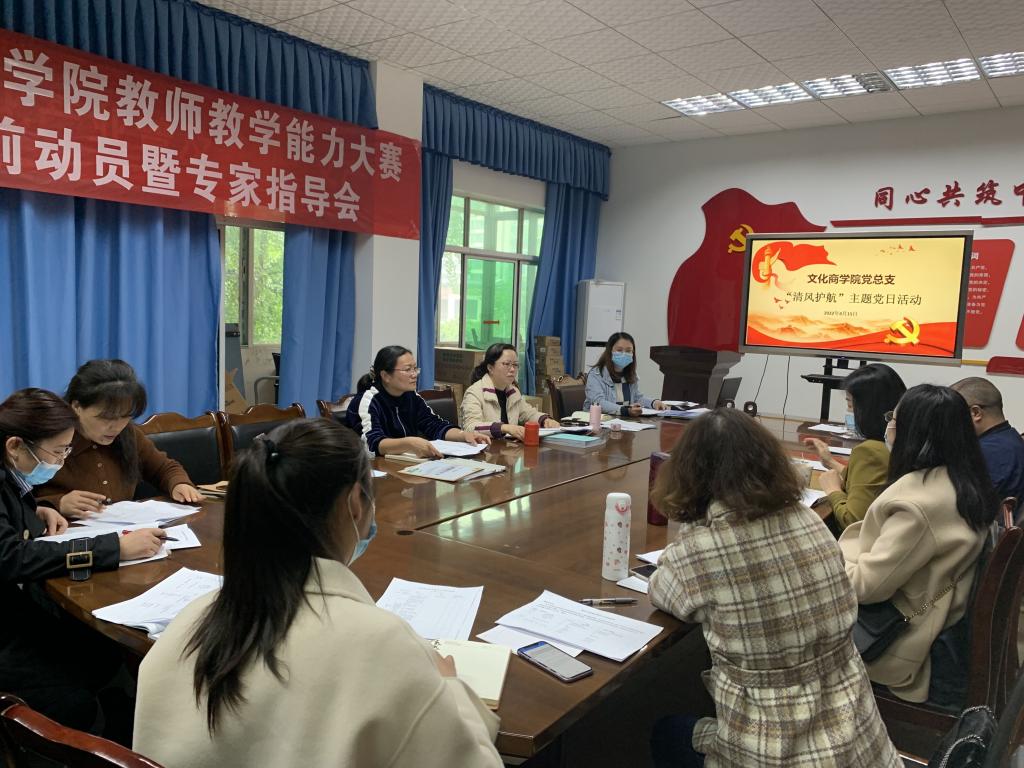 根据学校纪委《关于开展“清风护航”活动加强年轻干部教育管理监督的通知》文件精神,学院组织全体党员、“80后”非党员教职工参加了此次主题活动。文化商学院党总支纪检委员吴燕霞传达了文件精神,领学了《中国共产党纪律处分条例》《中华人民共和国公职人员政务处分法》等规定。她告诉党员特别是年轻干部要强化自身修为,增强政治定力,真正做到知敬畏、存戒惧、守底线。