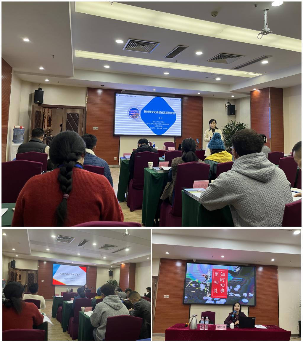 曾兴主讲题目是《新时代文化会展业高质量发展》,她从文化会展业高质量发展的时代背景展开讨论,介绍了新时代文化会展业发展的新趋势,分享了结合地域文化特色所完成的文化会展项目案例。谢力维主讲以《巴蜀四季农谚和节气礼仪》,围绕着知时知事更知礼的主线,分别从四季农谚的承载意义、文化内涵和文旅赋能三个维度进行深入介绍,探讨了传统文化与现代科技,历史智慧与现代文旅困境的相互关系。李林蓉副聚焦《文旅产品的宣传与推广》,她提出后疫情时期文旅产品宣传推广的难点及热点,从宣传人群、媒体选择、IP打造三个方面介绍了红原文旅产品宣传推广的路径和方法。
