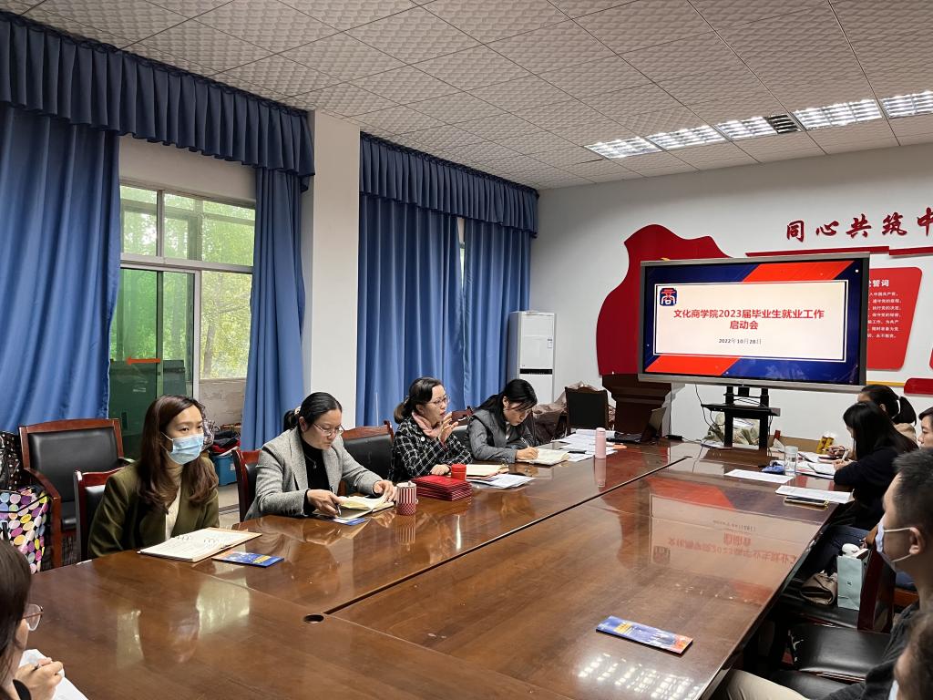 为高质量完成学院2023届毕业生就业工作,2022年10月28日,文化商学院在温故楼三楼会议室召开2023届毕业生就业工作启动会。学院党总支书记王维姝、副院长曾兴、就业干事、辅导员教师及全体专业教师参加了此次会,会议由吴燕霞副书记主持。