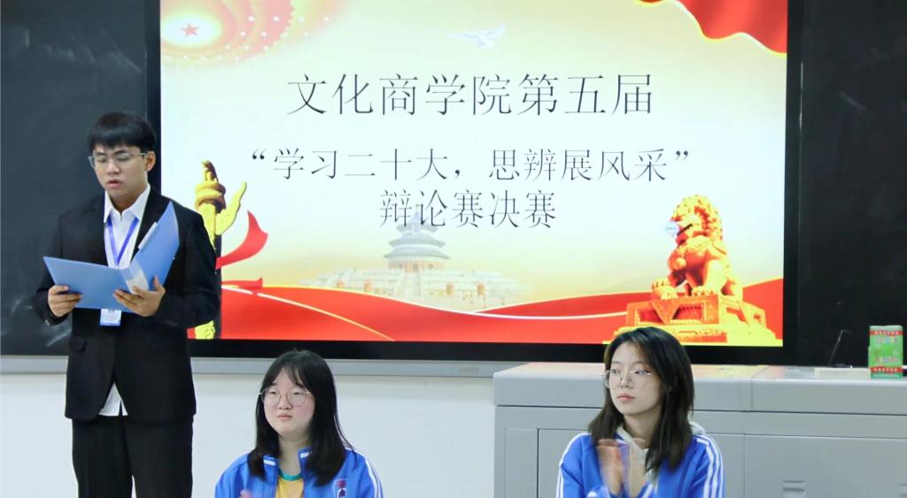 为学习贯彻党的二十大精神,锻炼同学们的语言表达能力、逻辑思维应变能力,提高学生团队协作能力,10月27日中午,文化商学院“学习二十大,思辩展风采”大学生辩论赛决赛在二教201教室开展。学院分团委副书记舒叶、分团委宣传部指导老师颜铃、团学组织主席团担任本次比赛的评委。