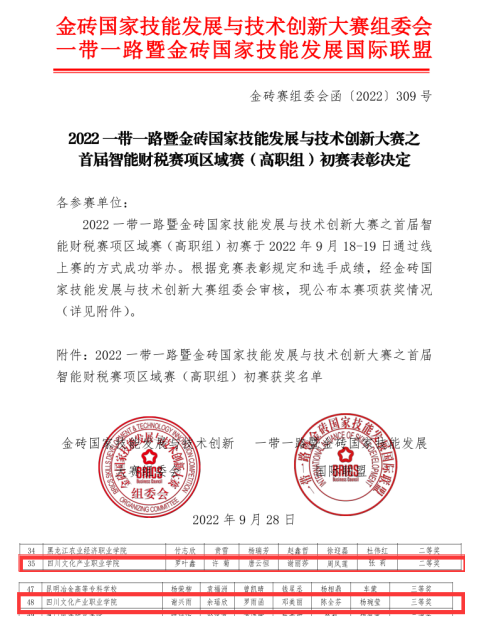9月19日,2022“一带一路”暨金砖国家技能发展与技术创新大赛之首届智能财税赛区域赛圆满落幕,经过三个赛段的比拼,文化商学院大数据与会计专业师生团队与来自全国25个省市的243个团队共计972名选手同台竞技,喜获(高职组)二等奖和三等奖。