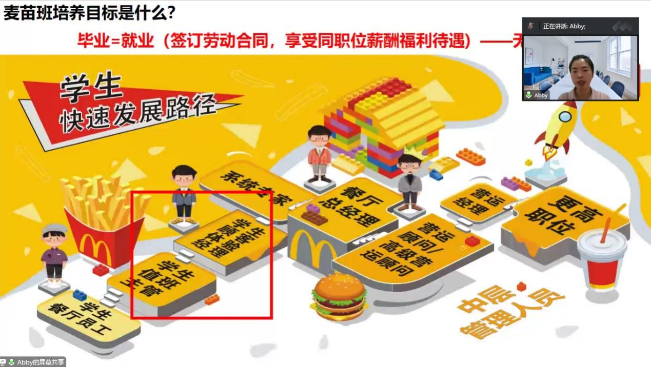 宋洁苹分别从企业发展概况、学徒制培养模式,培训课程、岗位实践、就业前景、已有的人才培养成果等方面就麦当劳现代学徒制“麦苗班”一一向同学们做了详细介绍。她建议同学们积极确立大学中自我实现的价值与目标,欢迎同学们选择“麦苗班”,为未来的学习与就业赋能。19级学姐、优秀员工张敏分享了参与学徒制的所学所获以及职业规划目标,鼓励学弟学妹们提前做好职业生涯规划和大学生活计划,还就学徒制相关问题做了详细解答说明。同学们对现代学徒制有了一定的认知,现场反馈良好。