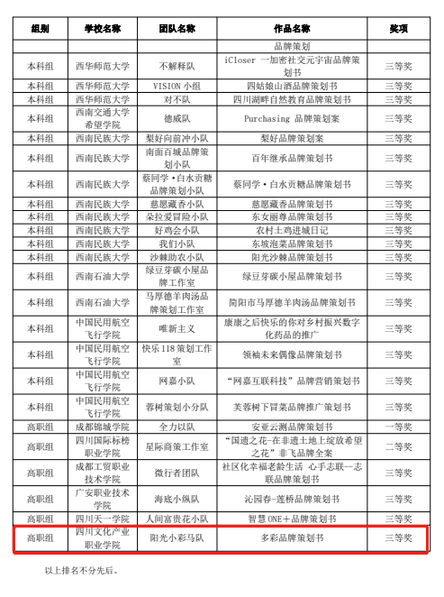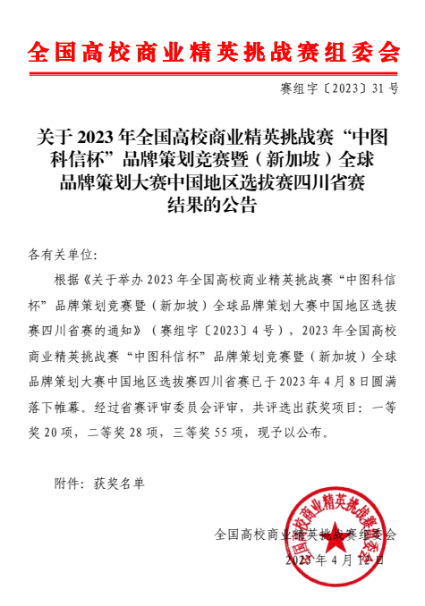 近日,2023年全国高校商业精英挑战赛“中图科信”杯品牌策划竞赛暨(新加坡)全球品牌策划大赛中国地区选拔赛四川省赛成绩公布。由文化商学院教师王琛、王晓兰指导,文化产业经营与管理、市场营销专业董梓苏、谢锦鹏、郭玉兰、王君怡、邬红燕五名同学组成的“阳光小彩马”学生团队荣获三等奖,并成功入围全国赛。
