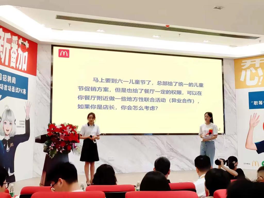 2023年5月19日,由四川金拱门食品有限公司主办的麦当劳全国招聘周“职等你来”四川市场首场面试PK赛决赛在西华大学郫都校区学术交流中心举行。为强化深度校企交流,促进校企资源共享,助推新型专业人才培养,让学生核心素养、就业技能落地落实,文化商学院积极组织学生参与比赛,2022级会展策划与管理专业学生甲差拉曲进入决赛并斩获优秀奖。
