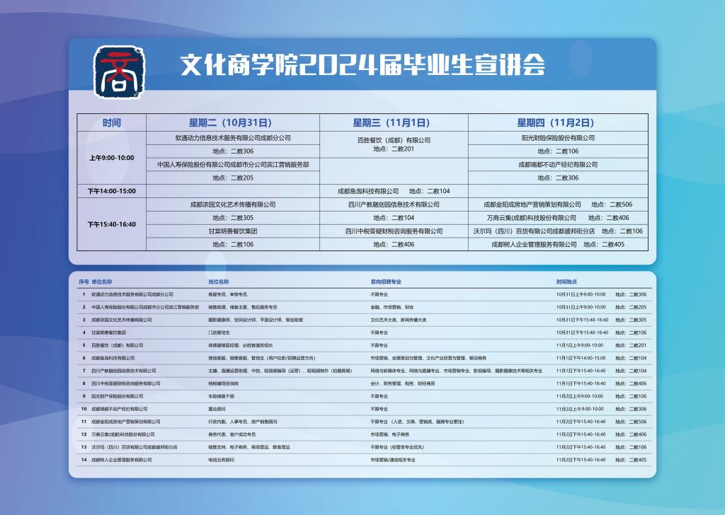 为保障2024届毕业生实现充分高质量就业,持续深化产教融合内涵,为用人单位、毕业生搭建双向选择平台,实现人才培养和产业发展同频共振,10月31日-11月3日,文化商学院邀请成都浓园文化艺术传播有限公司、百胜餐饮(成都)有限公司、四川产教融创园信息技术有限公司、沃尔玛(四川)百货有限公司等14家企业到校开展2024届毕业生企业宣讲会。