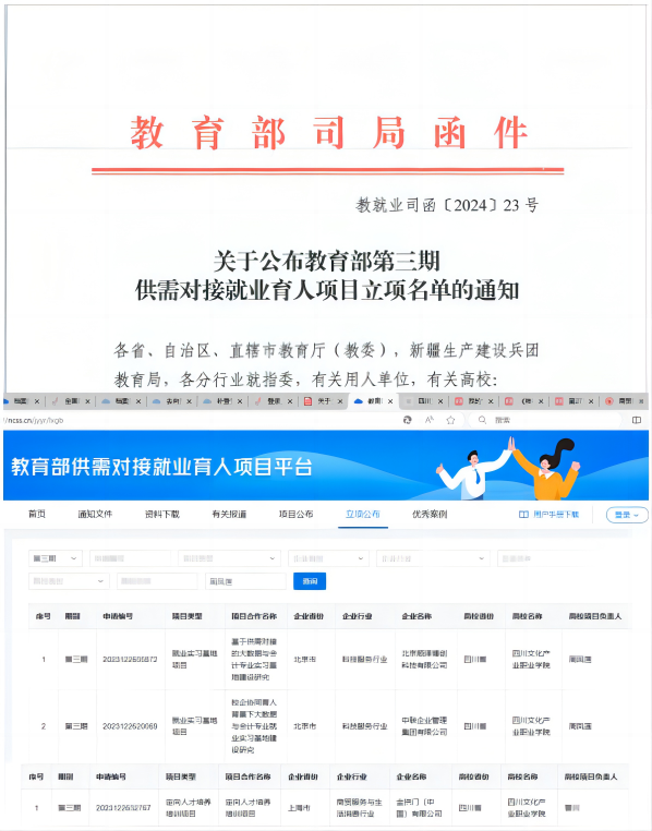近日,教育部公布了第三期供需对接就业育人项目立项名单,由文化商学院曾兴副院长主持的《现代学徒制定向人才培养项目》和周凤莲教授主持的《基于供需对接的大数据与会计专业实习基地建设研究》、《校企协同育人背景下大数据与会计专业就业实习基地建设研究》共3个项目成功立项,标志着学院在人才培养与就业指导方面迈出了关键一步。