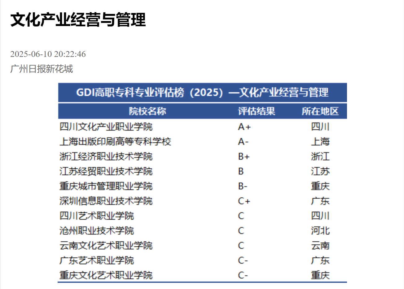 6月12日,广州日报数字化研究院(GDI智库)发布“GDI高职专科专业评估榜(2025)”,文化商学院“文化产业经营与管理专业”(以下简称“文经专业”)获得“A+”评估等级。