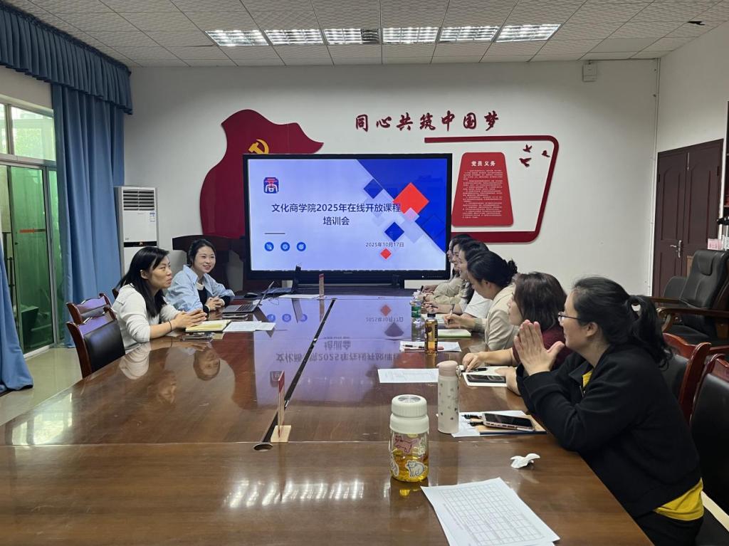 为高效推进课程项目建设,培育新时代“金课”,2025年10月17日,文化商学院在三楼会议室组织召开2025年度课程建设培训会。会议邀请课程建设项目承接方智慧树课程运营服务平台项目经理杨兴静做培训,学院院长曾兴、《经济学基础》等6门课程负责人及教务科老师参加会议。
