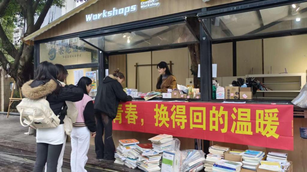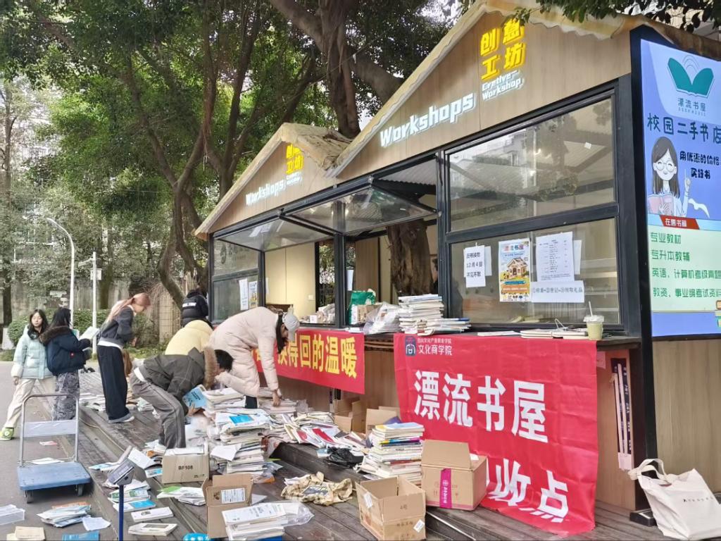 2025年12月4日,由创客梦工厂联合双创实践项目漂流书屋举办的以书易物活动在二食堂外街区温情落幕。本次活动以“带不走的青春,换得回的温暖”为主题,通过书籍交换实用物资的形式,让闲置书籍焕发新的生命力,也为同学们送去冬日关怀。